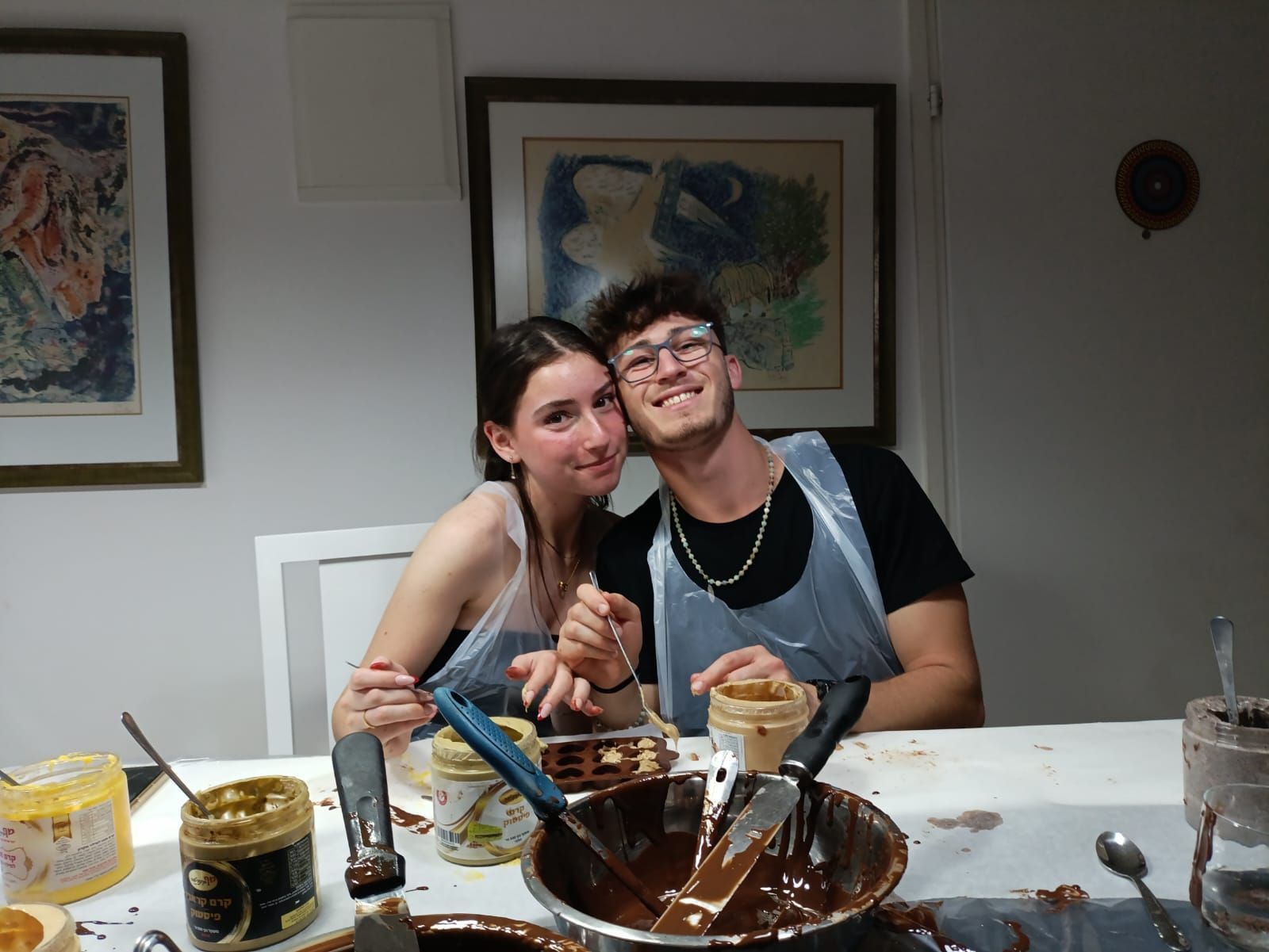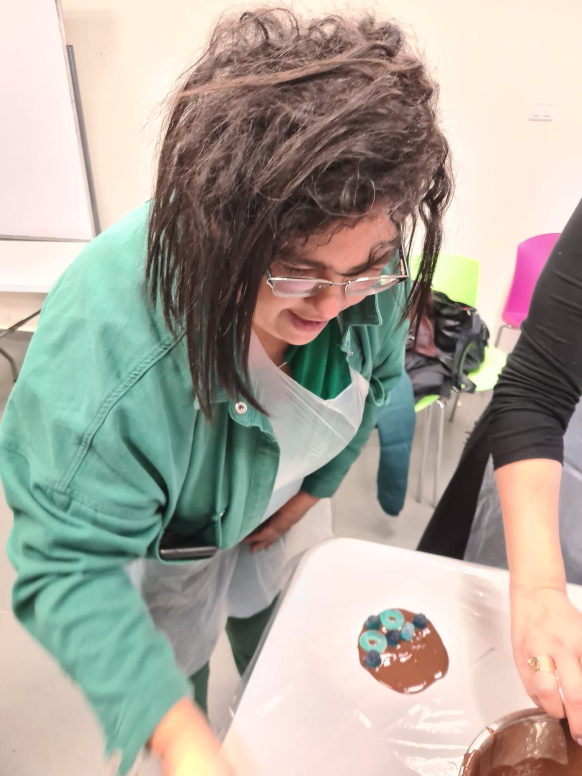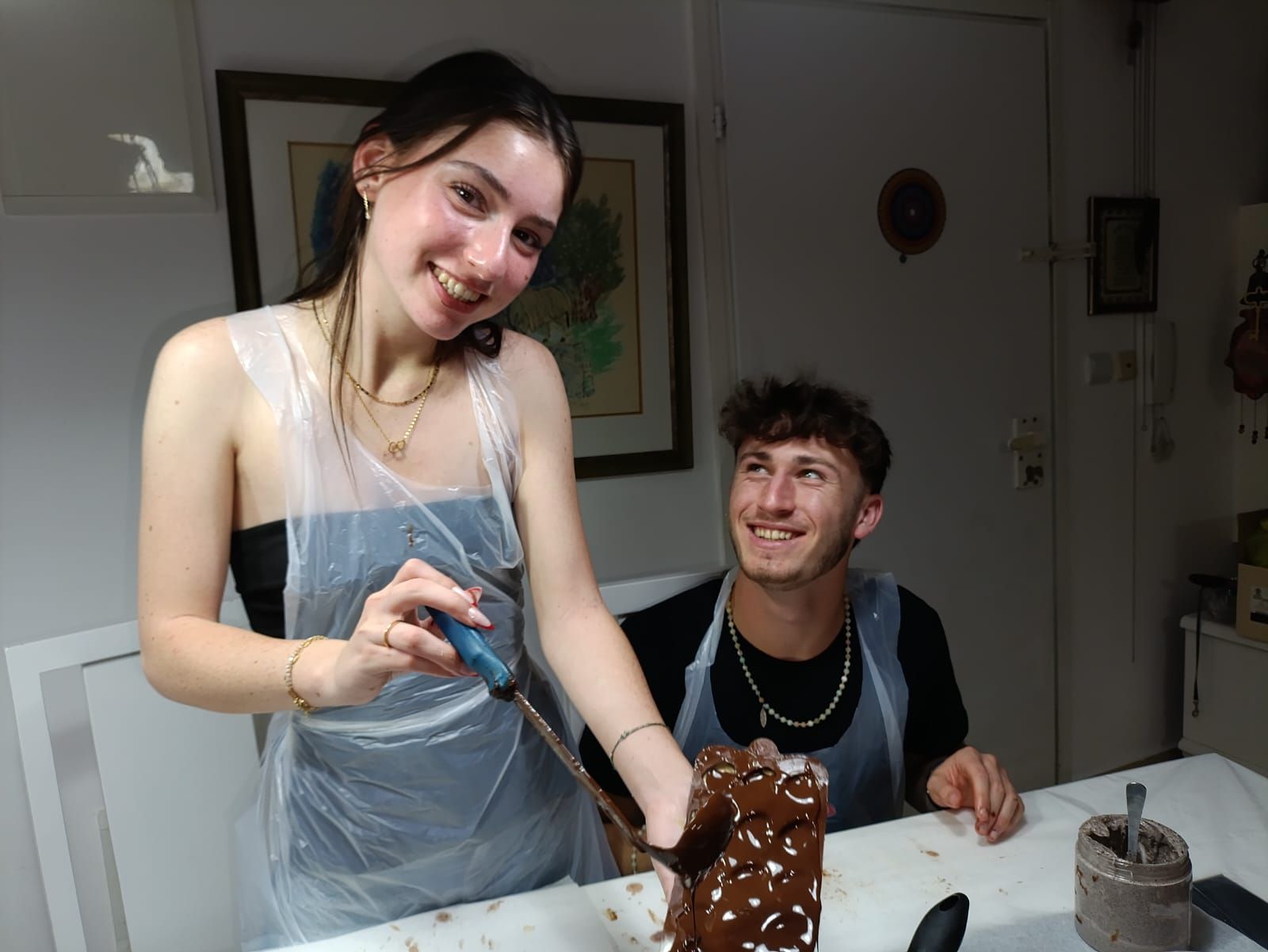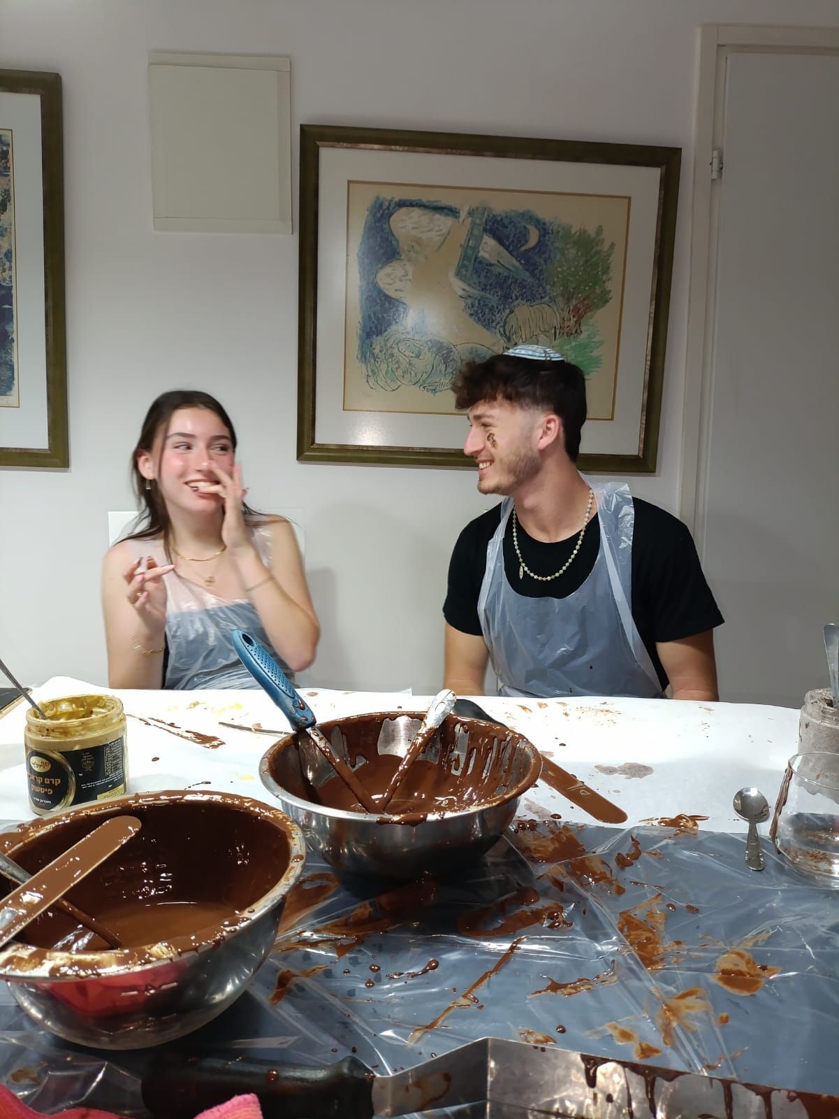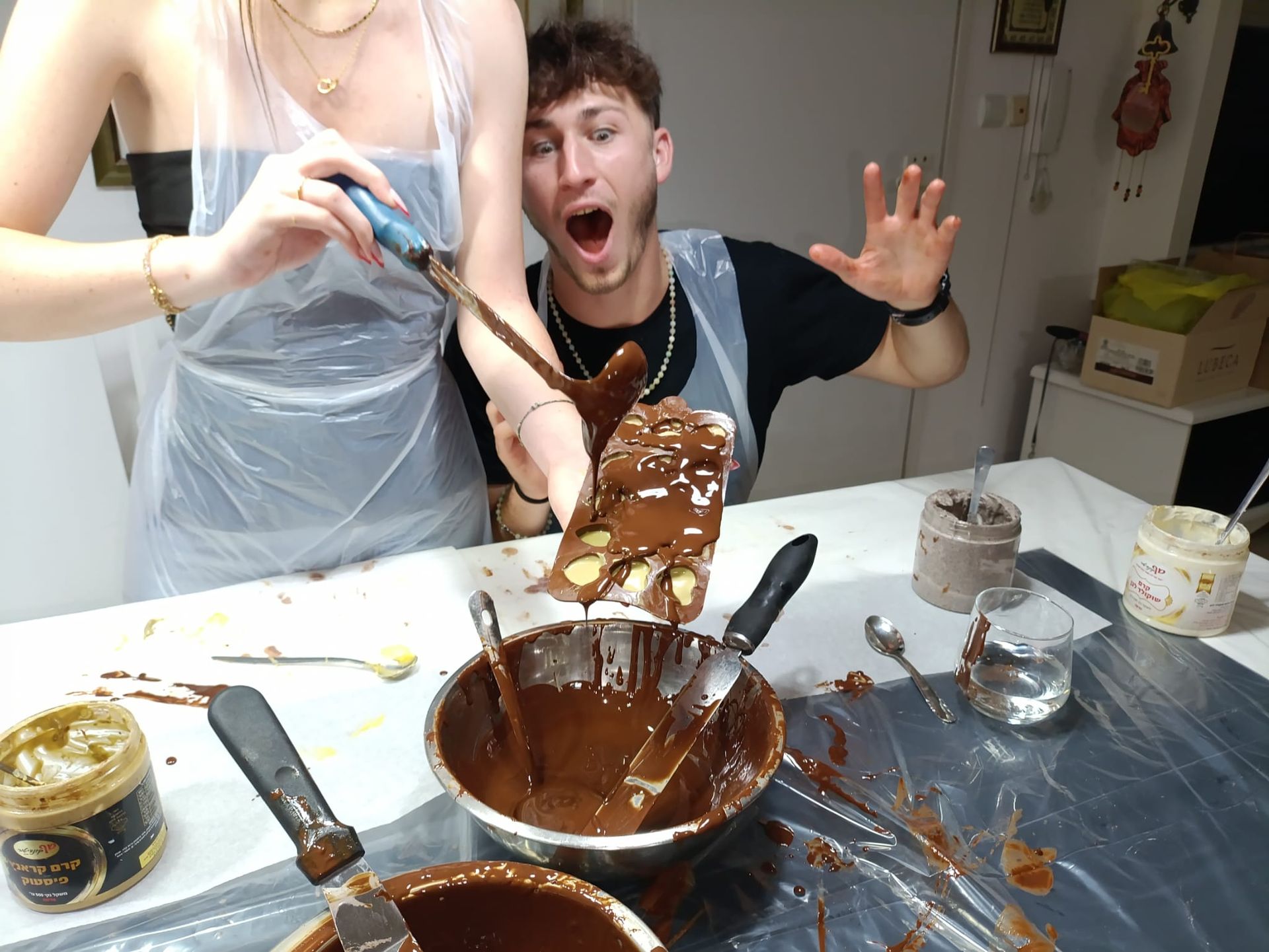 וככה הפכנו את כל המשתתפים למשפחה אחת. לשבת בצד ולראות אותם. לא צריך יותר מזה. העבודה בחומר הזה השוקולד. בהתחלה כולם נקיים כ שלבשו את הסינרים. כי פתאום נהיו להם כתמים שוקולדיים על הסינר. הכל יורד בכביסה אבל ההרגשה של האיסטניסטים האלו היא גם טובה. הם דיברו בידיים וגם בשוקולד.